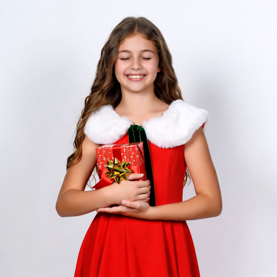 A young girl with long wavy brown hair smiles happily while holding a red gift box with a gold bow. She wears a festive red dress with white fur collar and green trim. The image is set against a plain white background.