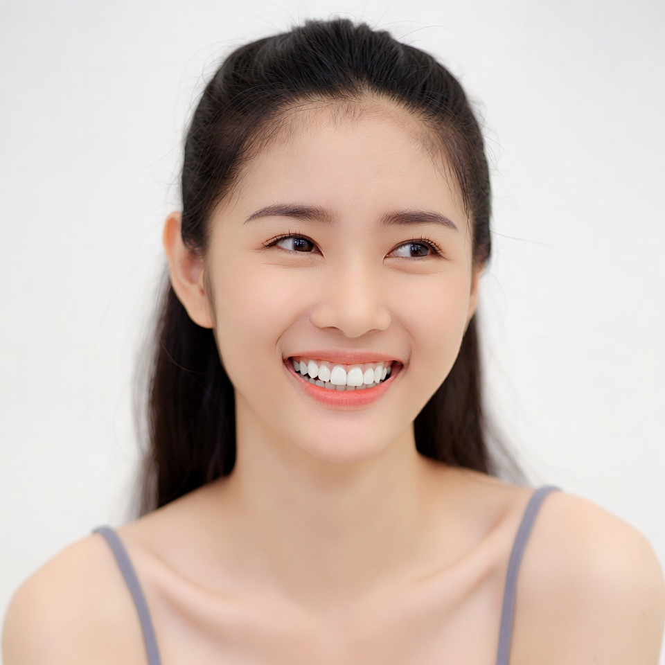 A young Asian woman with long dark hair tied in a ponytail smiles brightly at the camera. She has almond-shaped eyes and wears a thin gray camisole strap over her shoulder. The image is a close-up portrait against a plain white background.