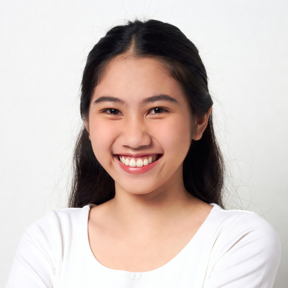 A young Asian girl with long black hair parted in the middle smiles warmly at the camera. She wears a white scoop-neck top and stands with arms crossed. Her face features bright eyes and pink lips against a plain white background.
