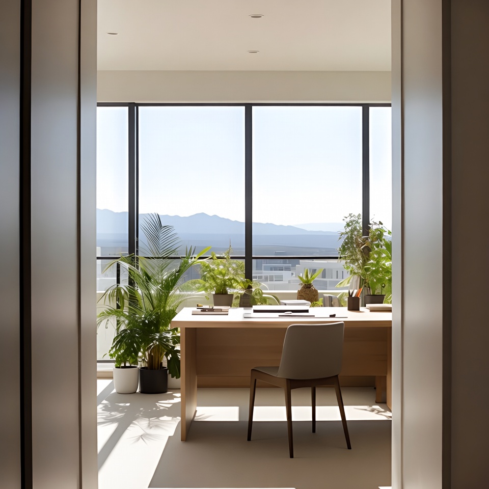 architecture, clear sky, desk, empty office, ferns, glass windows, gray chair, green plants, indoor plants, interior design, large windows, mountain view, mountains, natural light, office chair, palm plants, potted plants, sunlight, white walls, wooden desk, workspace, modern office