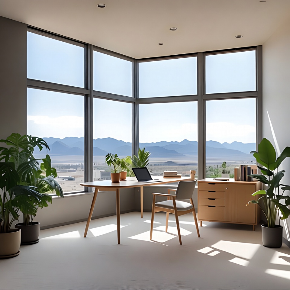 books, coffee mug, contemporary design, corner office, desert mountains, desk chair, empty office, ferns, glass windows, home office, indoor plants, laptop, large windows, minimalist room, monstera, mountain view, natural light, office interior, plants, potted plants, recessed lighting, scenic view, white walls, wooden desk, workspace, modern office