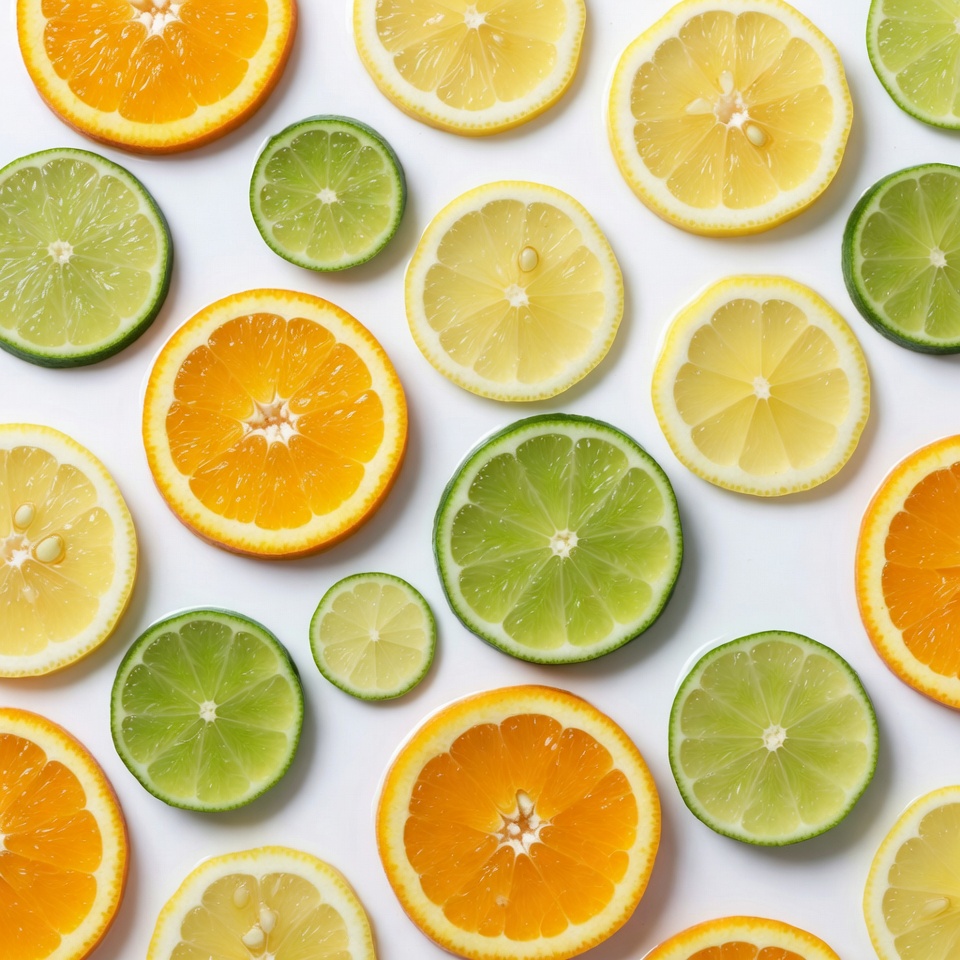 A flat lay arrangement of fresh citrus fruit slices on a white background. Vibrant orange slices, yellow lemon wedges, and green lime pieces are scattered in an overlapping pattern. The juicy segments and textured peels create a colorful composition.