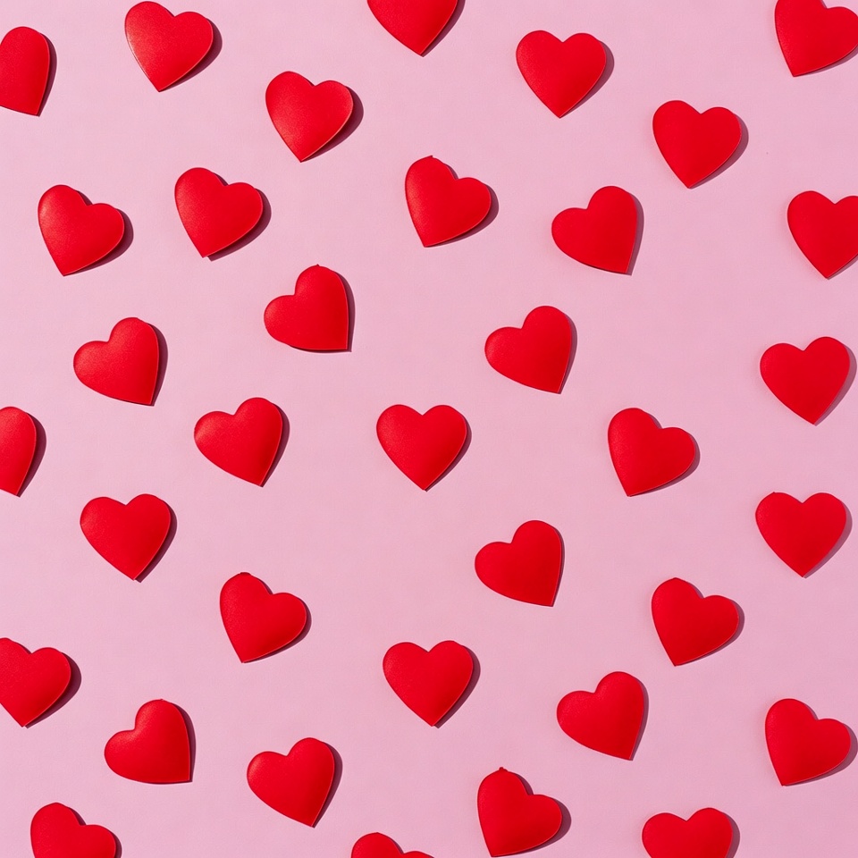 Numerous glossy red paper hearts are scattered across a solid pink background. The hearts vary slightly in size and overlap casually. The composition creates a vibrant, repetitive pattern.
