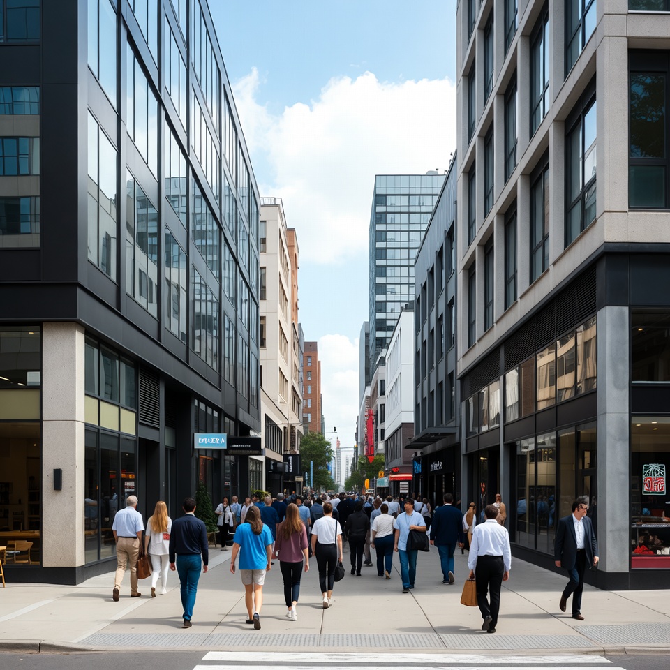architecture, bags, blue sky, briefcases, business attire, city life, clouds, crosswalk, diverse crowd, downtown, glass skyscrapers, high-rise, men, modern buildings, narrow alley, office district, pedestrians, pedestrians walking, sidewalk, street crossing, suits, urban scene, walking people, women, city street