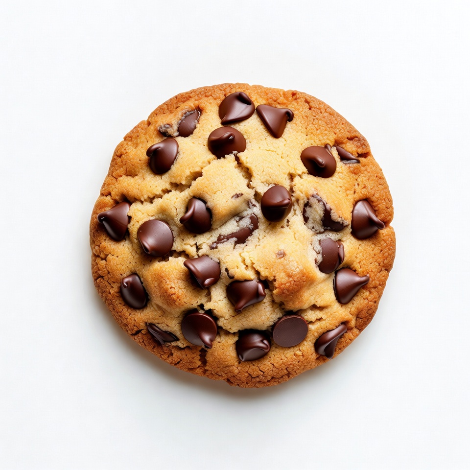 baked goods, bakery item, chips, chocolate chips, cookie, delicious cookie, dessert, dough, food photography, golden brown, isolated, overhead shot, snack, top view, treat, white background, chocolate chip cookie