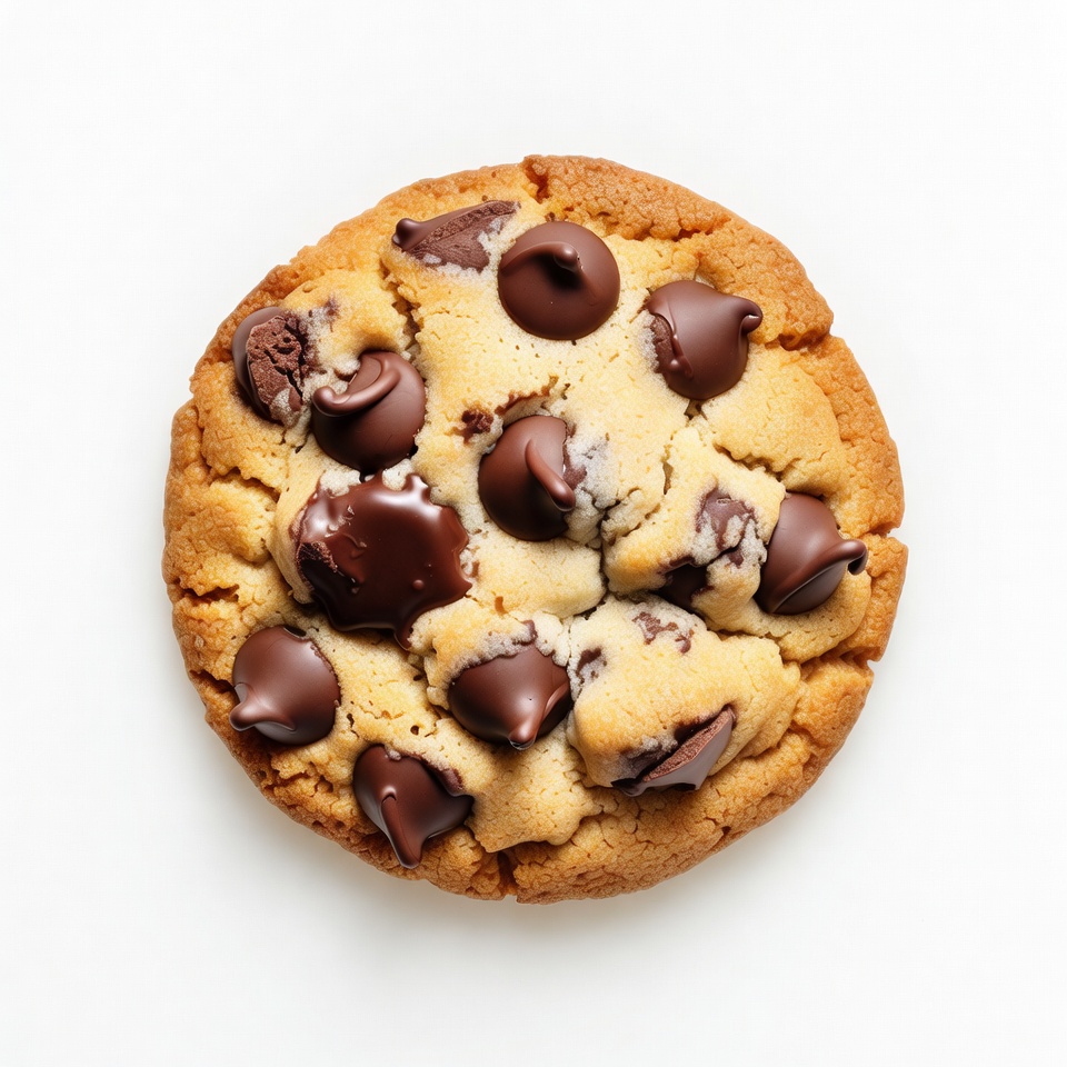 baked goods, bakery, chips, chocolate chips, cookie, delicious cookie, dessert, dough, food photography, fresh cookie, golden brown, gourmet cookie, melty chocolate, overhead shot, round cookie, snack, sweet treat, top view, white background, chocolate chip cookie