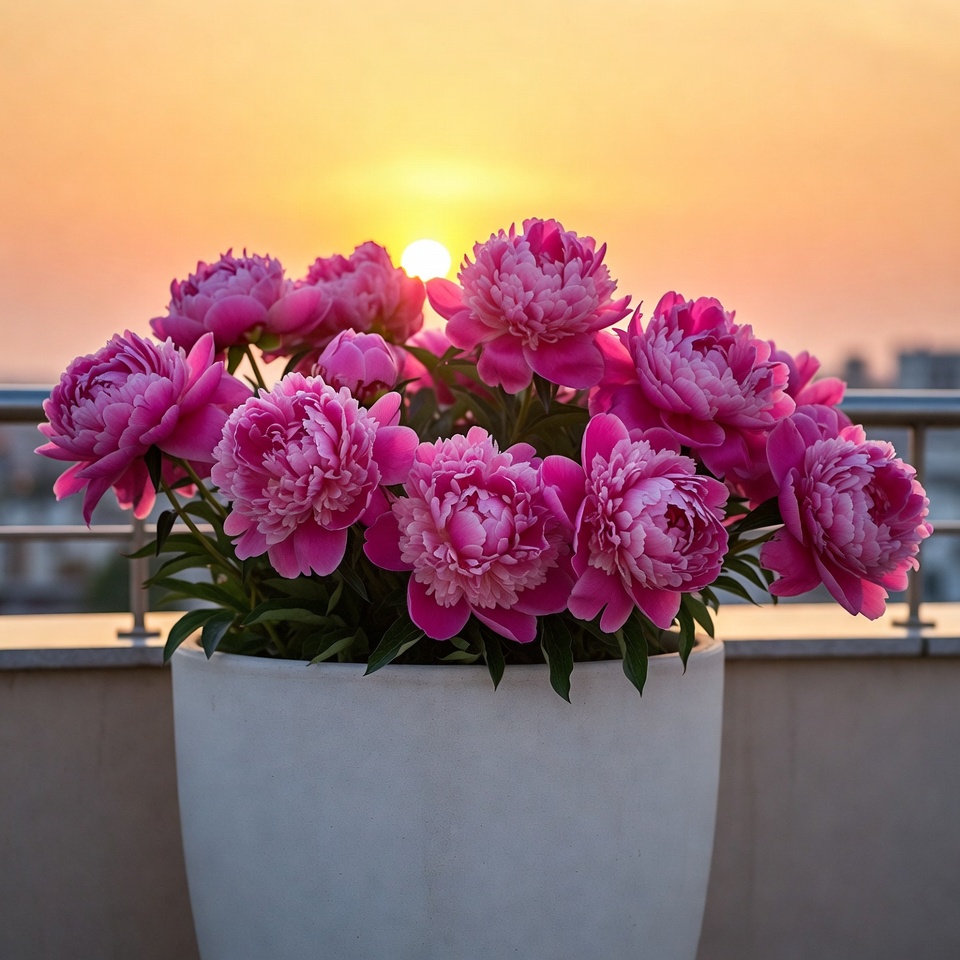 balcony, bloom, city balcony, evening light, floral, flowers, garden, lush, orange sky, outdoor, peony bouquet, peony flowers, petals, plants, railing, summer flowers, sunset, vibrant, white pot, pink peonies