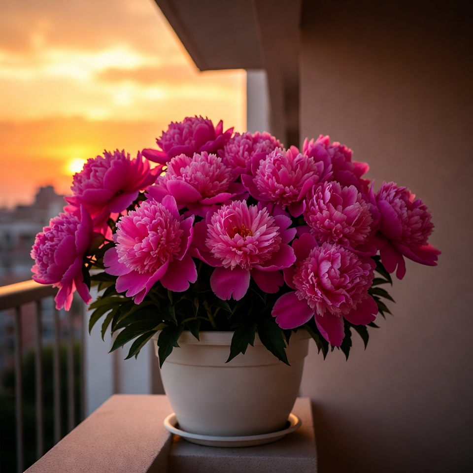 balcony, bloom, cityscape, evening light, floral arrangement, flower pot, flowers, garden, lush blooms, orange sky, peony bouquet, petals, plants, potted plant, railing, sunset, urban balcony, vibrant flowers, white pot, pink peonies
