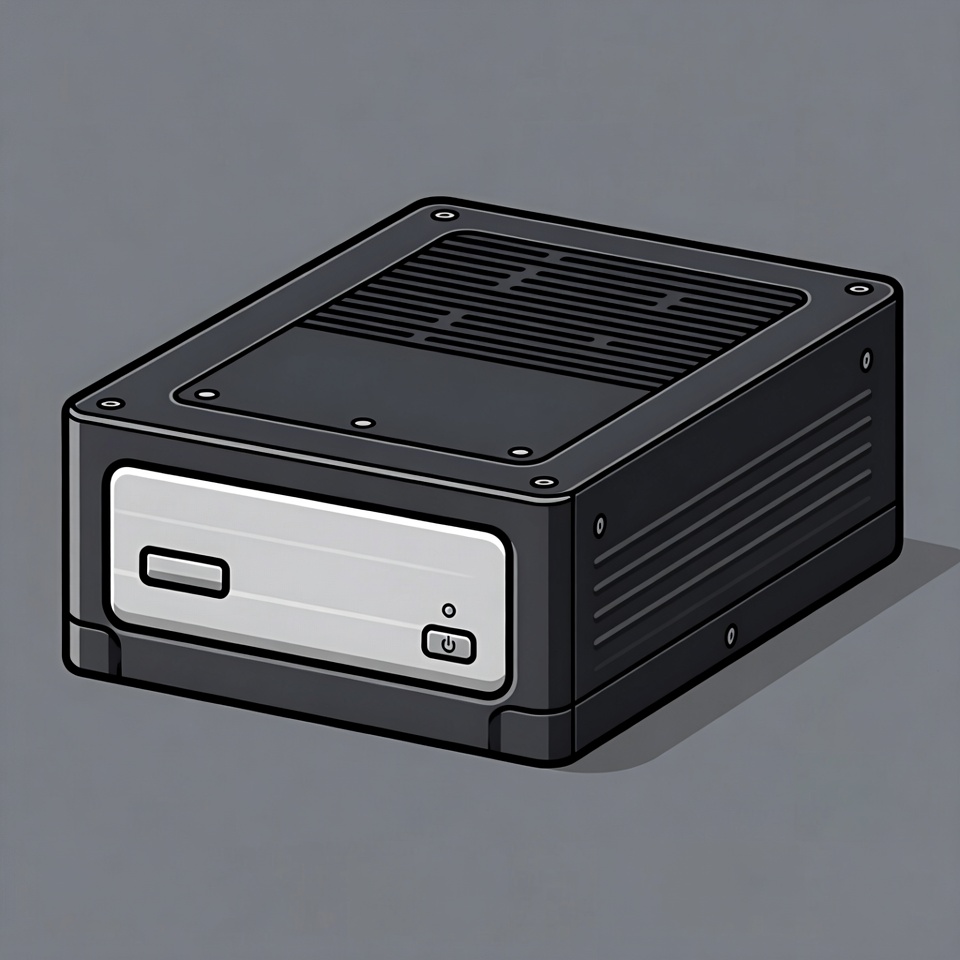 A detailed illustration of a black desktop computer tower with a silver front panel and power button. It features ventilation slits on the sides and top, rendered in a flat vector style with subtle shading. The computer is shown from a three-quarter angle on a gray background.