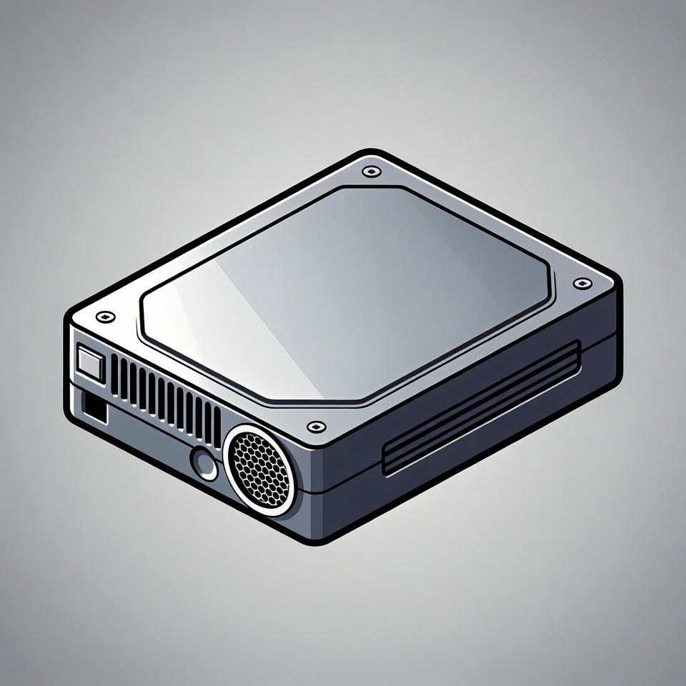 A cartoon-style illustration of a rectangular hard drive with a silver top panel and dark gray sides. It features ventilation grills on the sides, ports on the back, and a glossy metallic finish. The object is depicted in isometric view against a light gray background.
