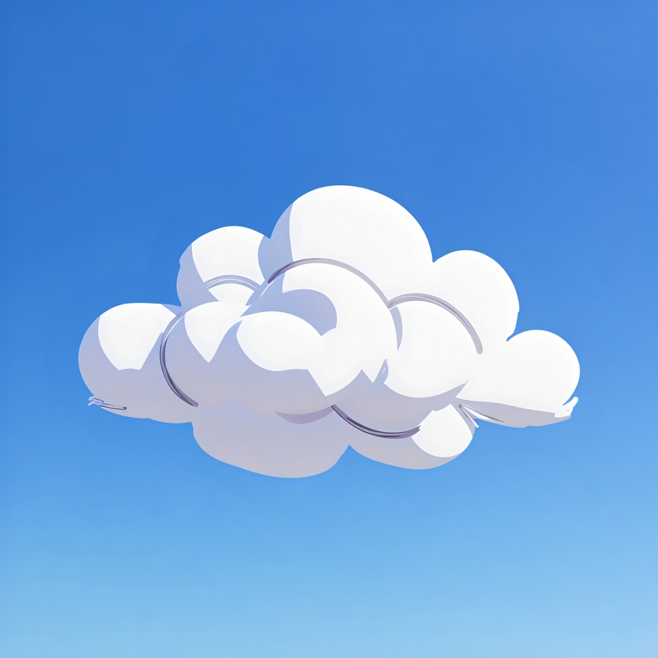 A cartoonish fluffy white cloud floats against a vibrant blue sky. The cloud features rounded, puffy shapes with smooth shading and subtle outlines. It is rendered in a 3D illustration style on an isolated background.