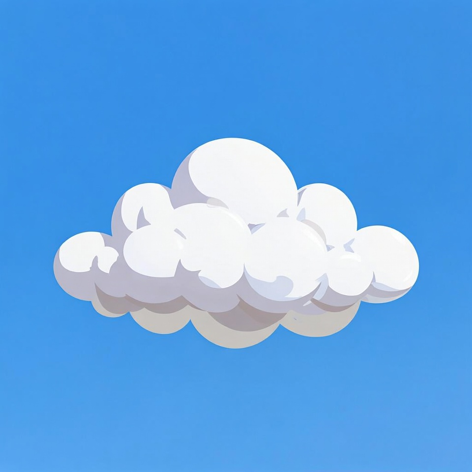 A cartoon illustration of a large fluffy white cloud floats against a solid blue sky background. The cloud has rounded, puffy shapes with soft shading. It is centered and isolated on the vibrant blue backdrop.