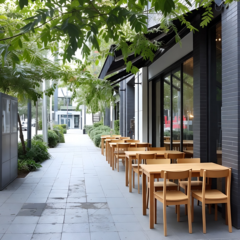 black building, city cafe, empty tables, foliage canopy, glass windows, green trees, modern architecture, outdoor dining, outdoor patio, paved walkway, plants, restaurant terrace, seating area, urban street, wooden chairs, wooden tables, cafe
