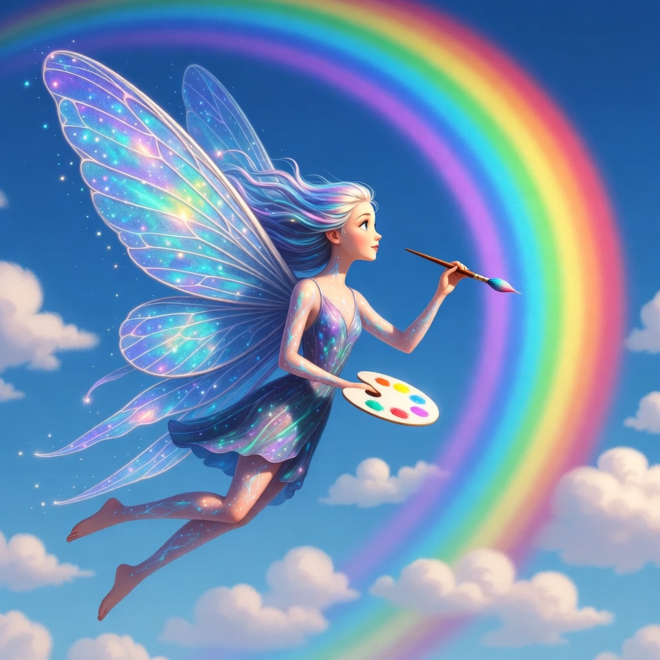A young fairy with long blue hair and sparkling wings flies in the sky while painting a vibrant rainbow with a paintbrush. She holds a colorful palette in one hand and wears a flowing purple dress. Fluffy clouds surround her against a bright blue background.