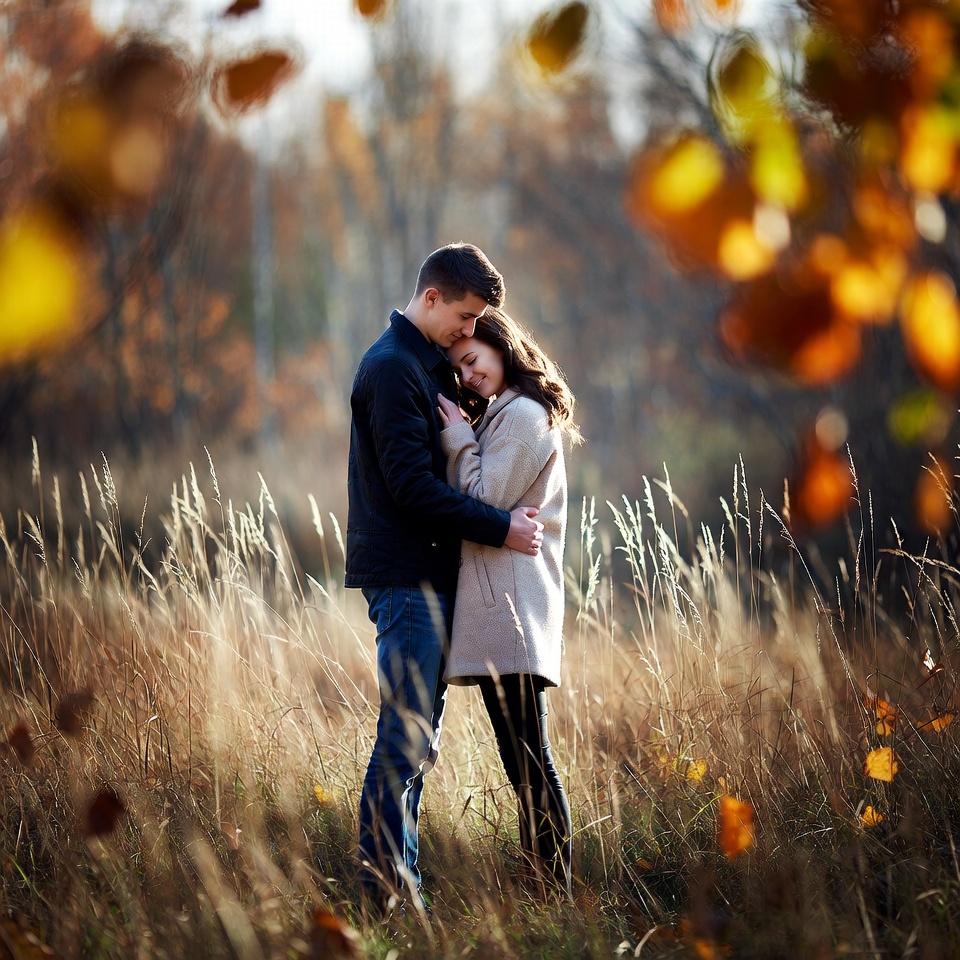 A man and woman embrace closely in a golden autumn field surrounded by tall grass and falling leaves. The man wears a dark jacket and jeans while the woman is dressed in a light coat and leggings. Vibrant orange and yellow foliage blurs in the background under soft sunlight.