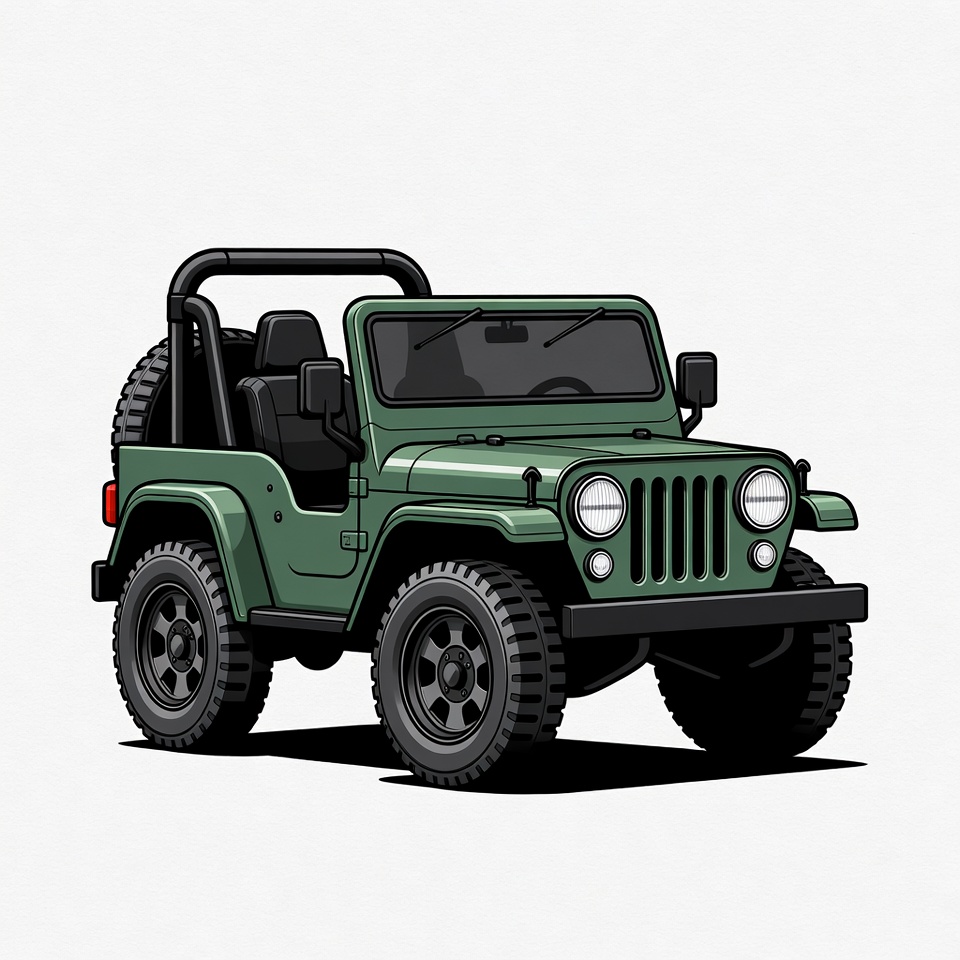 4x4, SUV, adventure vehicle, automotive illustration, clipart, green jeep, grille, headlights, illustration, isolated background, jeep, military jeep, off-road vehicle, roll bars, rugged tires, vector art, white background, Jeep Wrangler