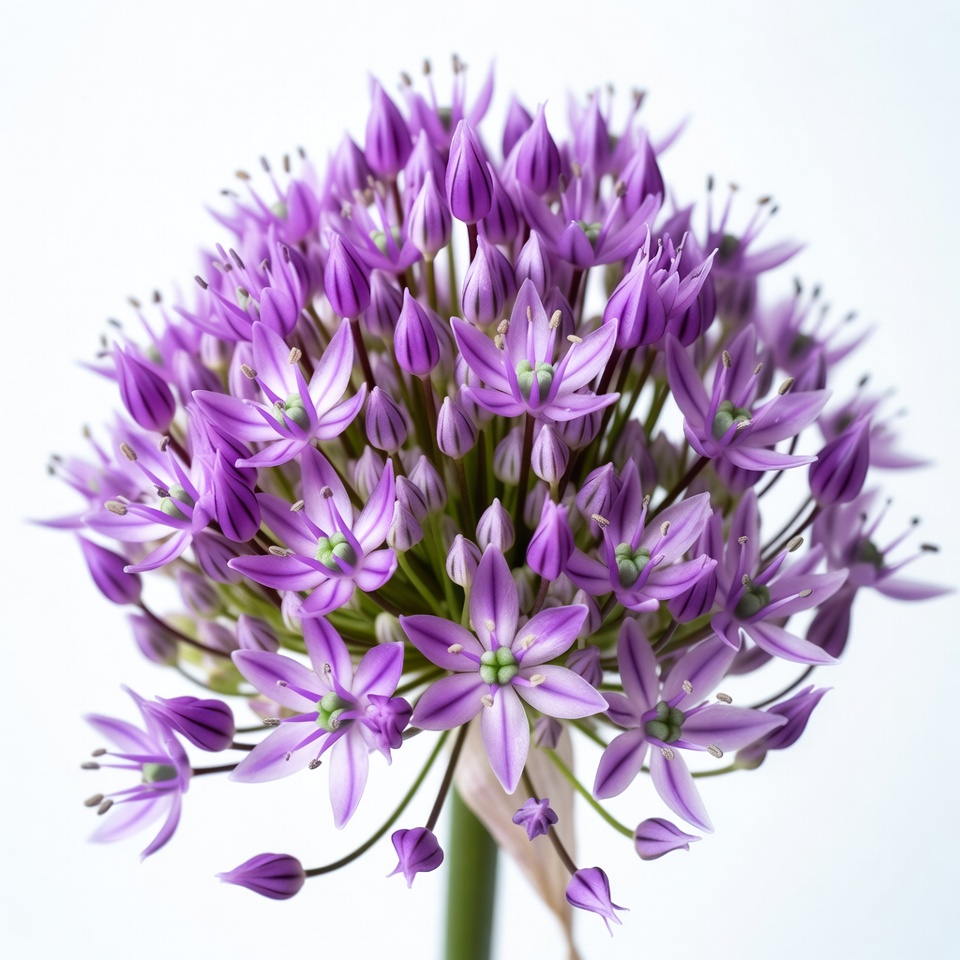 allium, blooming flower, botany, buds, cluster flower, floral, florets, flower closeup, flower head, flower stem, garden flower, green centers, nature, ornamental plant, petals, purple bloom, purple flower, star shaped, white background, allium flower