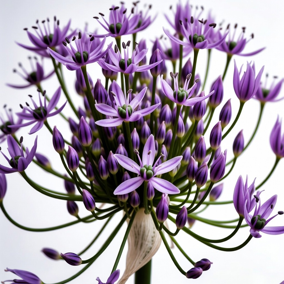blooming flower, botany, cluster flower, floral, florets, flower bloom, flower cluster, flower head, gardening, green stems, nature, ornamental flower, plant, purple allium, purple flower, star shaped, white background, allium flower