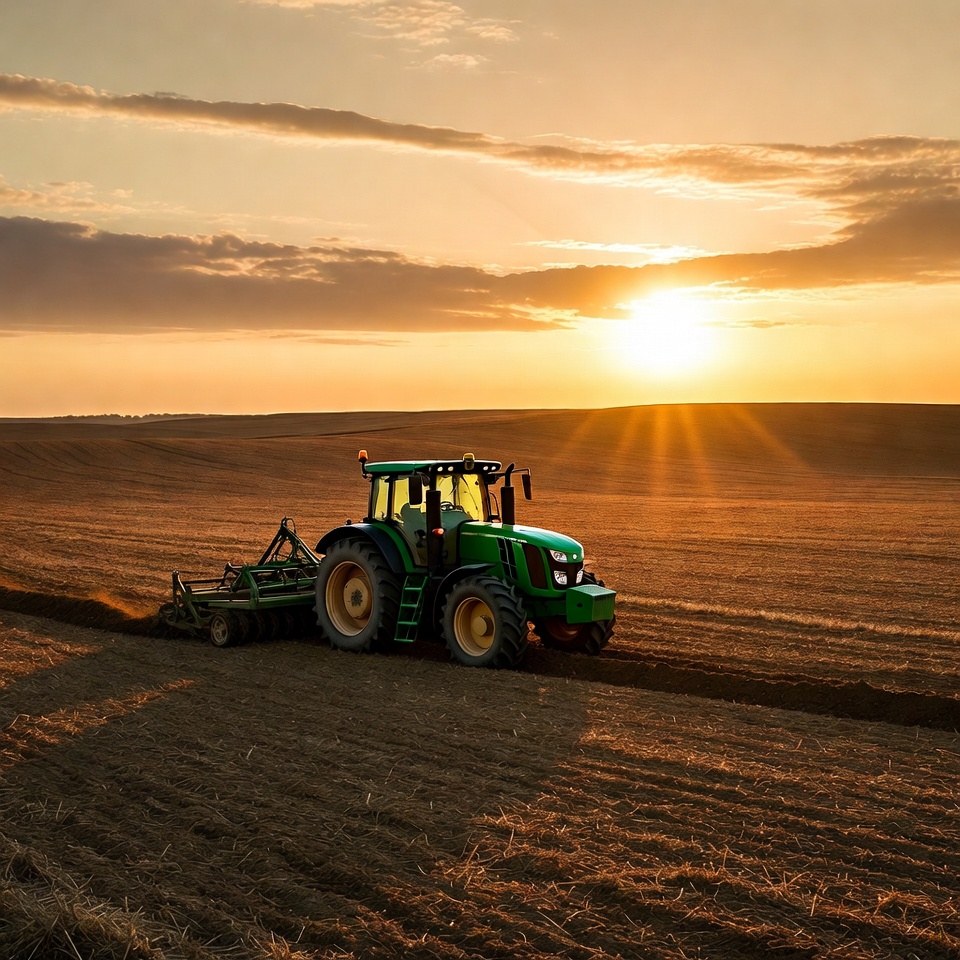 John Deere, agriculture, clouds, countryside, crop field, cultivator, farm equipment, farming, field, furrows, golden hour, green tractor, harvest, isolated background, machinery, plowing, rural, soil, sunrise, sunset, wheels, tractor