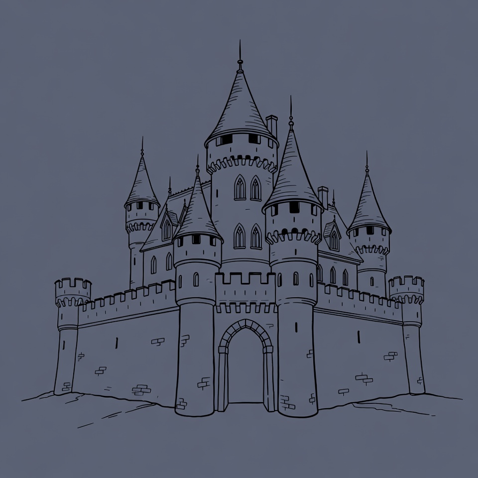 arched gate, architecture, battlements, clipart, fantasy, fortress, illustration, ink sketch, isolated background, line drawing, medieval castle, spires, stone walls, towers, castle