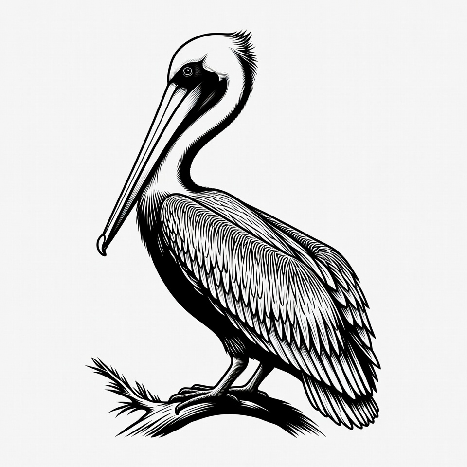 avian, beak, bird, black and white, branch, clipart, detailed drawing, feathers, illustration, isolated background, line art, perched, sea bird, standing bird, vector art, wildlife, pelican
