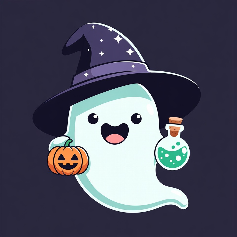 A kawaii cartoon ghost wears a tall black witch hat and holds a small orange pumpkin in one hand and a green potion bottle in the other. The ghost has big sparkling eyes, a wide smiling mouth with tongue out, and floats on a dark background. The illustration features vibrant colors and a playful Halloween theme.