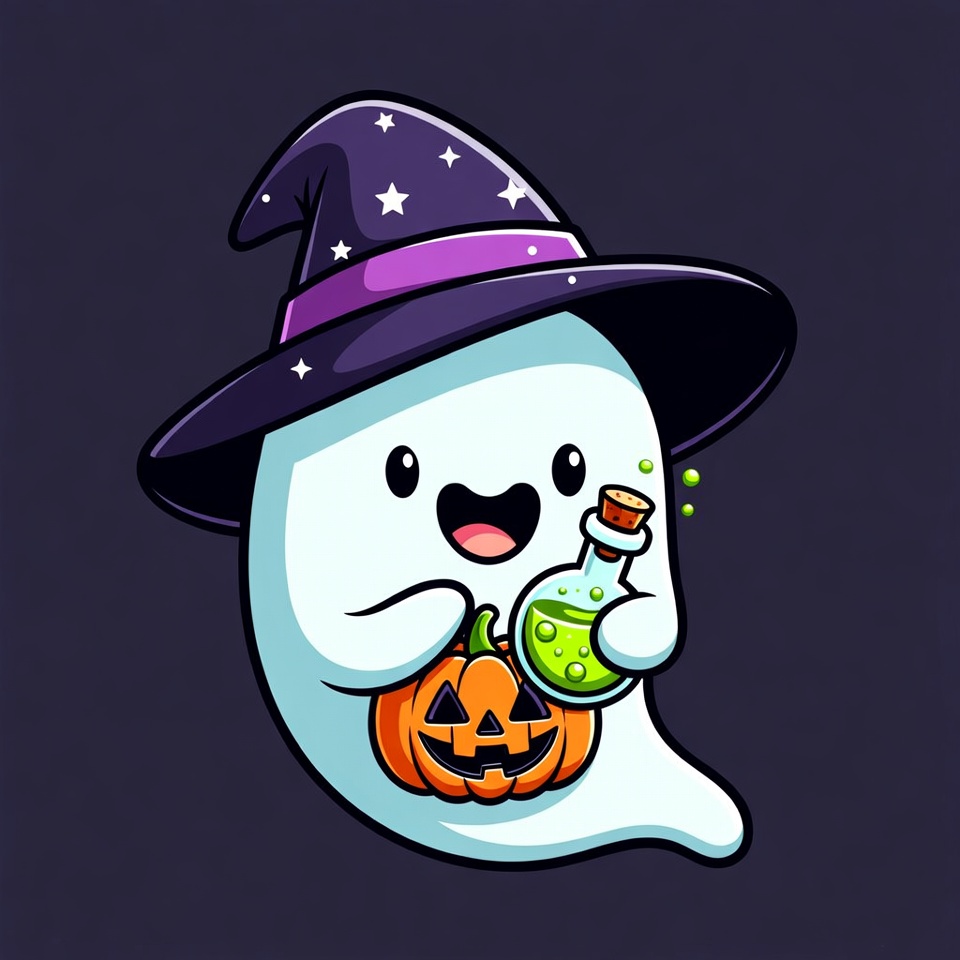 adorable, cartoon, chibi, clipart, cute, festive, green potion, halloween, illustration, isolated background, jack o lantern, kawaii, potion, pumpkin, purple hat, smiling ghost, spooky, starry hat, vector art, whimsical, witch, ghost