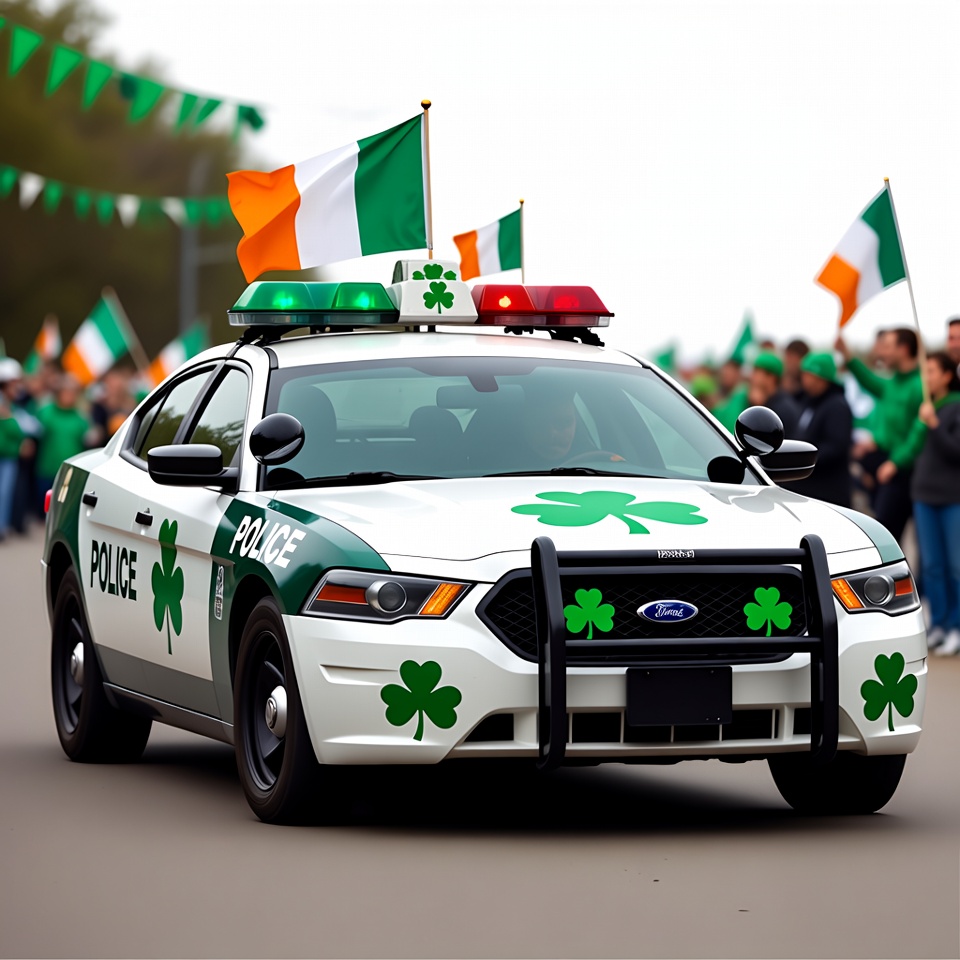 Ford car, Ireland flag, Irish flags, St. Patricks Day, crowd, emergency lights, festive car, green clothing, green decorations, green theme, holiday celebration, law enforcement, marching crowd, parade, police vehicle, shamrocks, spectators, street parade, white vehicle, police car