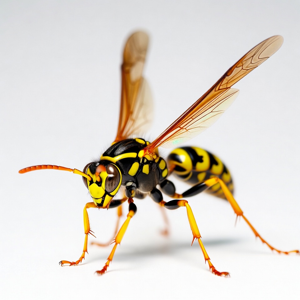 A detailed yellow jacket wasp with black and yellow striped body stands on a plain white background. Its wings are partially spread, revealing translucent sections, and its large compound eyes and antennae are prominently visible. The insect's legs are extended, showcasing its orange-tinted tarsi.