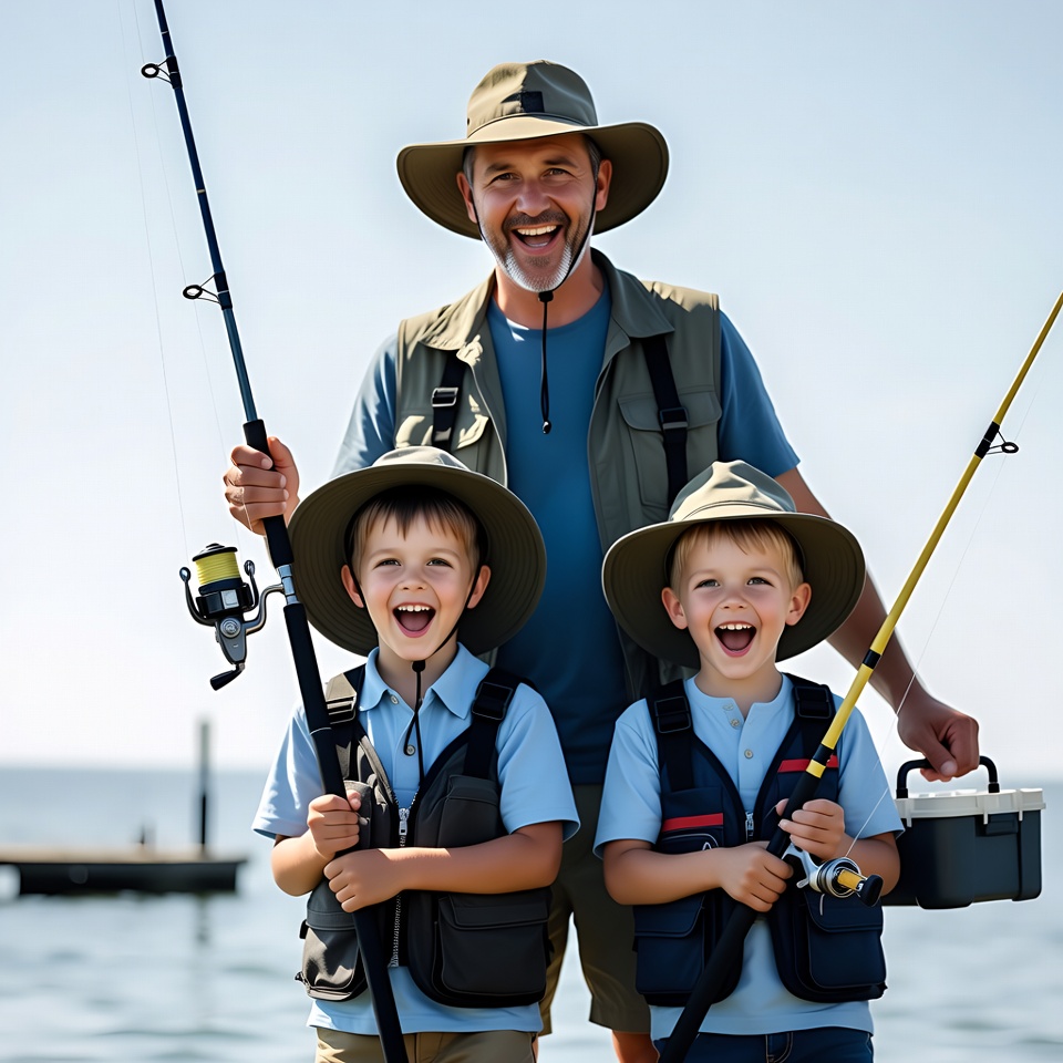 A smiling father wearing a khaki hat and vest stands with his two young sons on a wooden dock by the water. The boys, dressed in blue shirts, khaki vests, and matching hats, hold fishing rods with reels. They all grin excitedly while the father holds a tackle box.