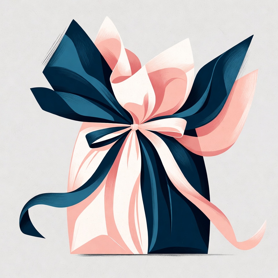 A vibrant illustration of a gift box wrapped in white paper with navy blue and pink ribbons. A large bow sits on top, featuring layered navy, white, and pink sections. The design is set against a plain gray background.