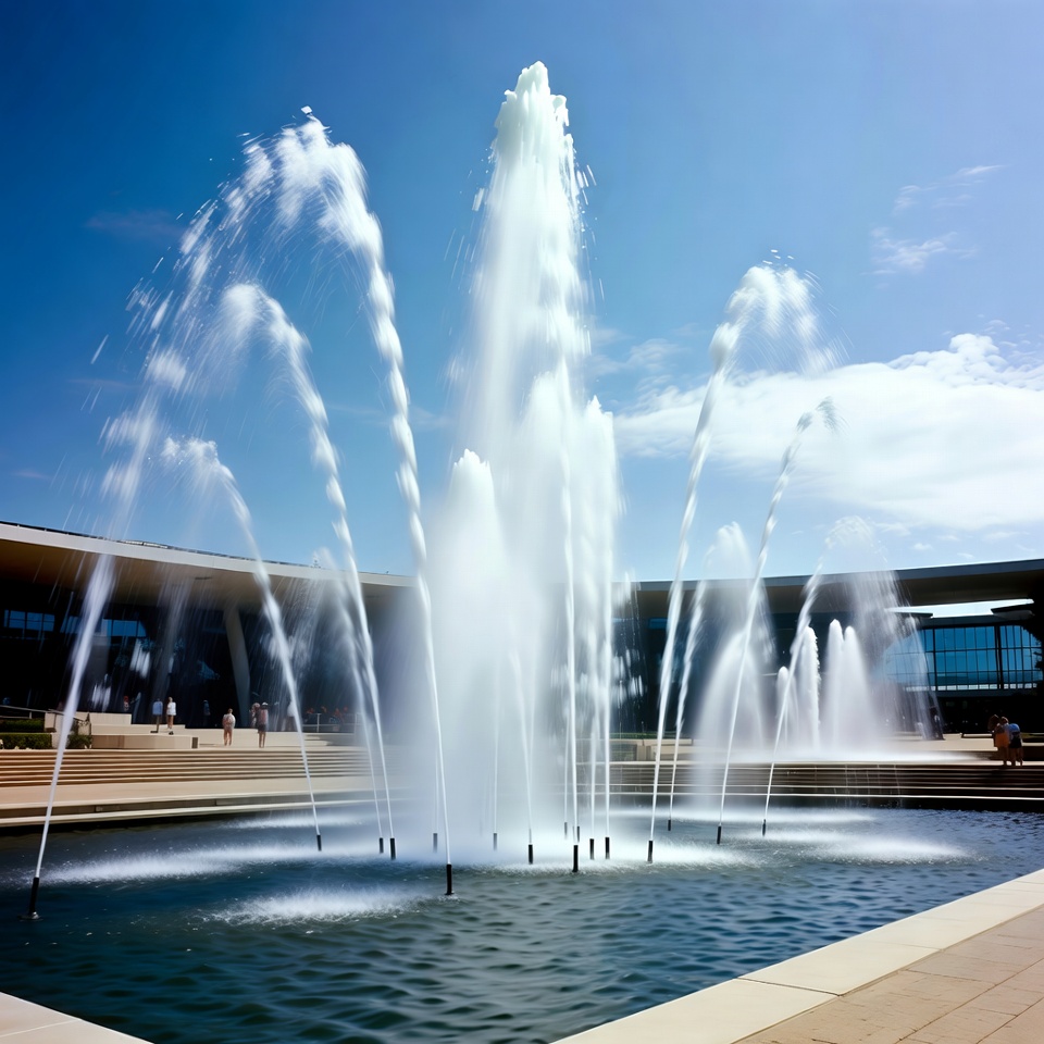 A large fountain with multiple tall white water jets sprays upward from a dark pool. The fountain is situated in a spacious plaza with tiled surroundings and steps. In the background, a sleek modern glass building stands under a clear blue sky, with a few distant people visible.
