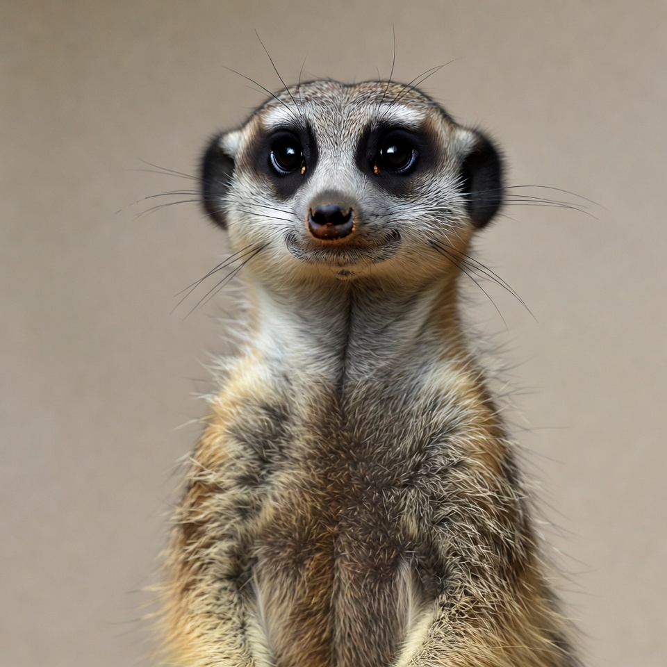 animal, beige background, brown fur, cute meerkat, isolated background, large eyes, mammal, meerkat portrait, safari animal, small ears, standing, upright, wild animal, wildlife, meerkat