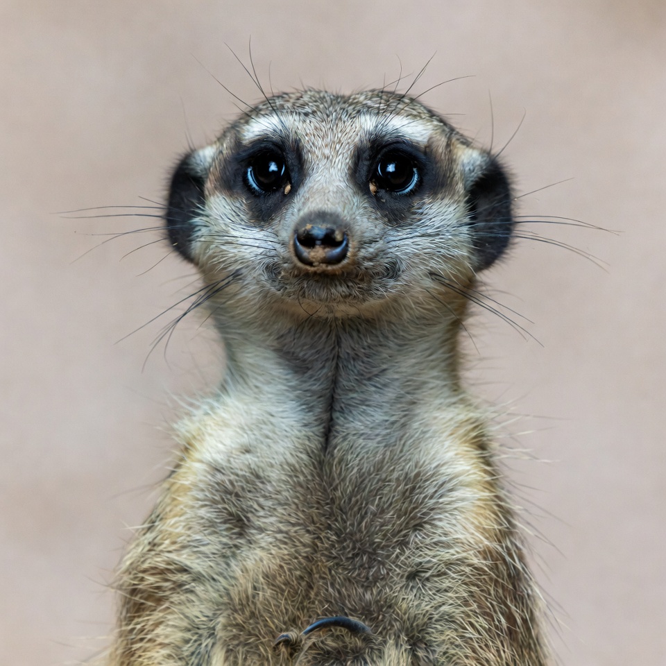 A meerkat stands upright on a beige background with large, expressive eyes and dark markings around its face. Its fur is light brown with darker patches on the ears and body. The animal looks directly at the camera with a curious expression.