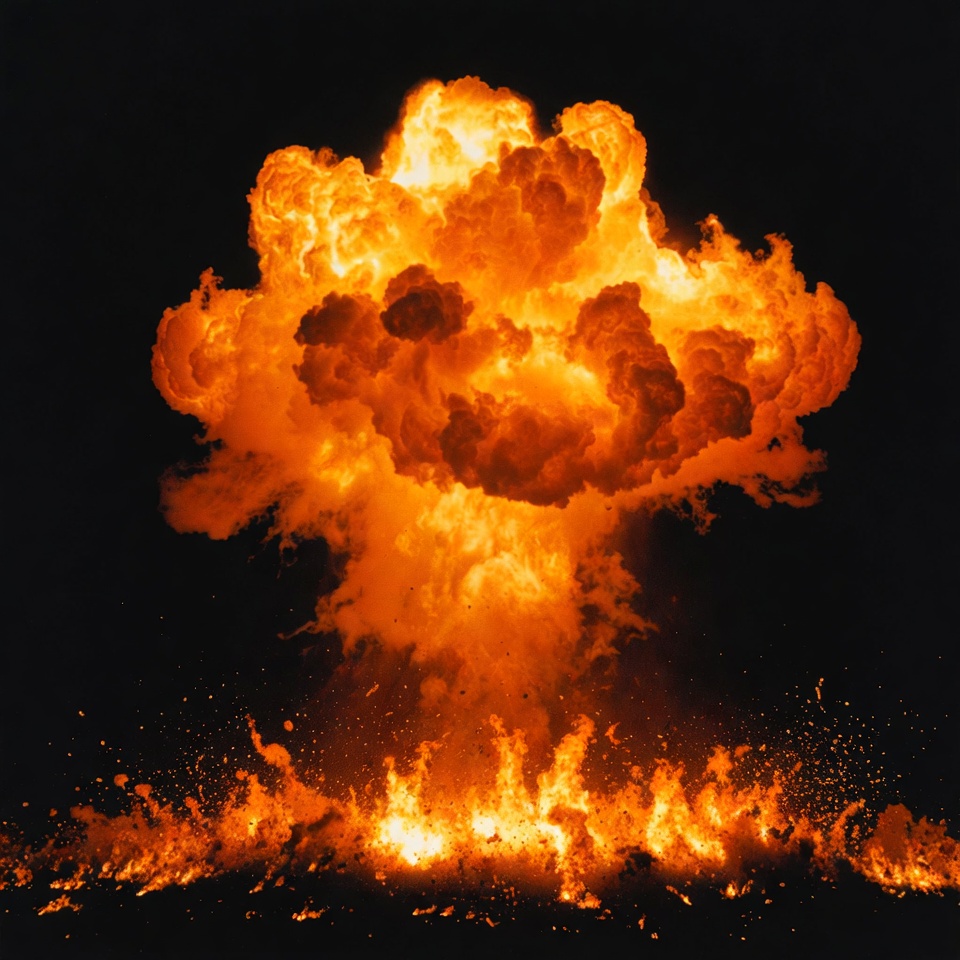 atomic bomb, black background, blast, debris, destruction, detonation, energy, explosion, fiery base, fire, fireball, flames, heat, inferno, nuclear explosion, orange cloud, pyroclastic, radiant, shockwave, smoke, towering plume, volcanic eruption, mushroom cloud