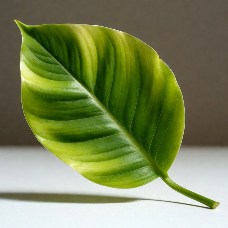 A single large green leaf with yellow variegated stripes lies flat on a white surface. The leaf features prominent veins and a smooth edge, angled slightly to show its texture. It has a short stem and is isolated against a light gray backdrop.