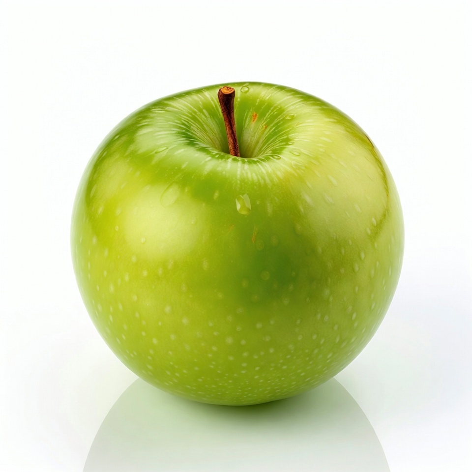 apple, fresh fruit, fruit, healthy fruit, isolated background, produce, ripe apple, shiny apple, stem, water droplets, white background, green apple