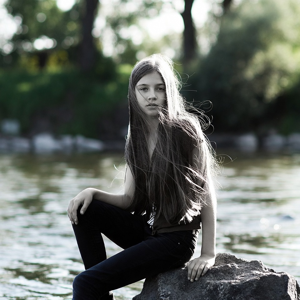black pants, casual clothes, dark hair, dark top, female, flowing hair, forest edge, green background, long hair, natural light, nature, outdoors, portrait, river, riverside, rock, sitting, stones, summer, teenager, trees, water, water edge, young girl, girl
