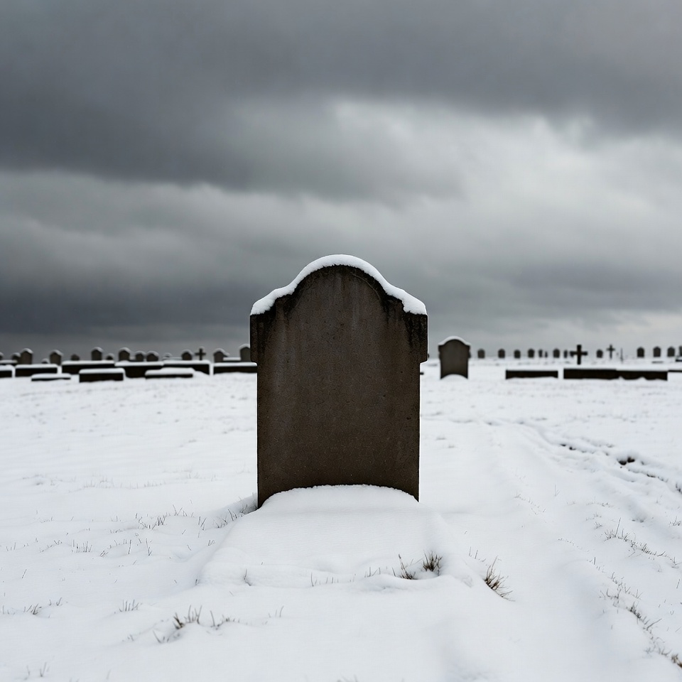 bleak landscape, burial site, cemetery, clouds, cloudy sky, crosses, dark clouds, frozen ground, gravestone, graveyard, headstone, memorials, overcast, path, snow, snowy, stone grave, white snow, winter, tombstone