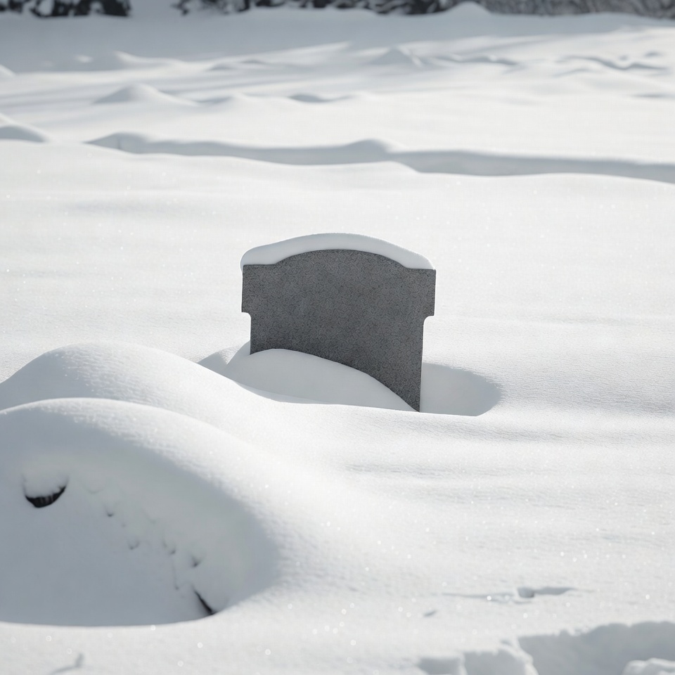 A gray gravestone with a curved top is partially covered in snow and stands upright in a vast snowy field. Snow drifts surround the base of the tombstone, blending into the white horizon. The scene features smooth snow waves under overcast skies.