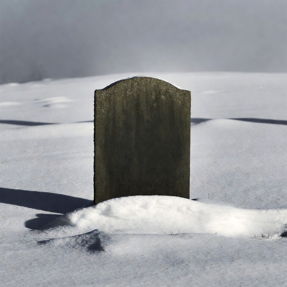 A tall, dark gravestone stands in a vast snowy field under a foggy sky. Snow covers the ground around its base, with a long shadow cast behind it. The arched top of the stone is visible against the white landscape.