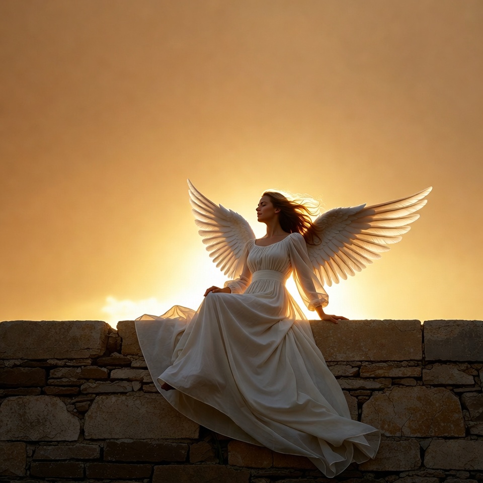 A woman dressed as an angel with large white wings sits on a stone wall at sunset. She wears a flowing white gown with long sleeves and has long red hair blowing in the wind. The warm golden sky illuminates her serene profile.