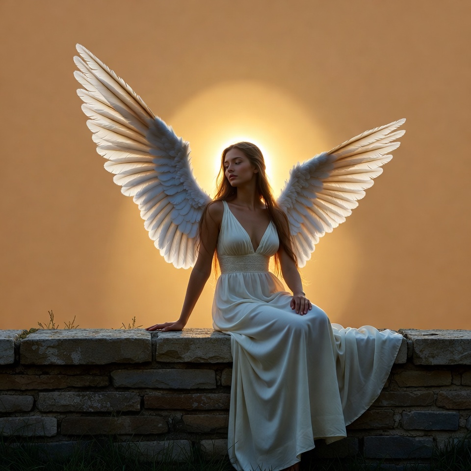 White, angel wings, ethereal, fantasy, female, flowing dress, glowing light, golden halo, illustration, long hair, low neckline, orange sky, red hair, sitting pose, stone wall, sunset, white dress, white wings, woman, angel woman