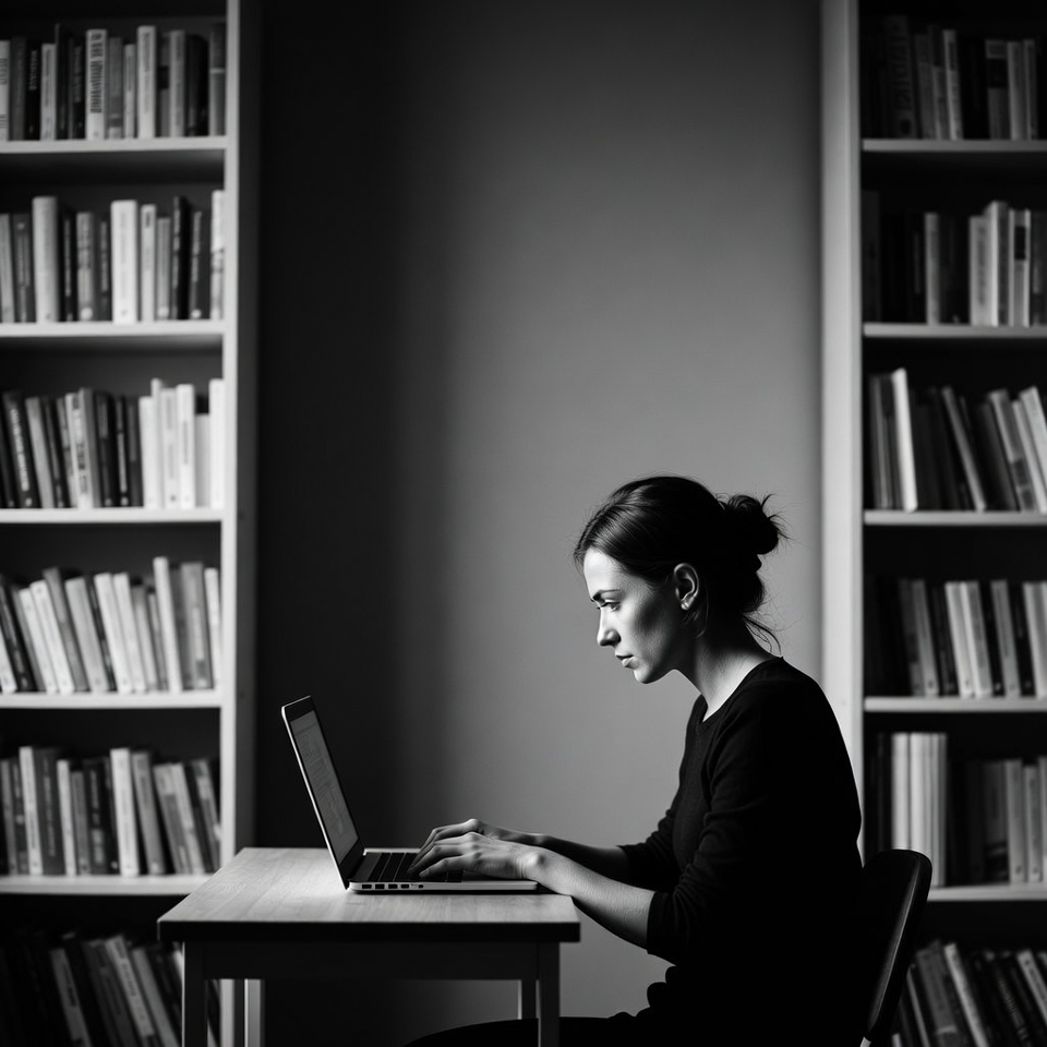 A woman with dark hair in a bun sits at a wooden desk typing on a laptop. She wears a black top and is surrounded by tall bookshelves filled with books. The scene is in black and white with soft lighting.