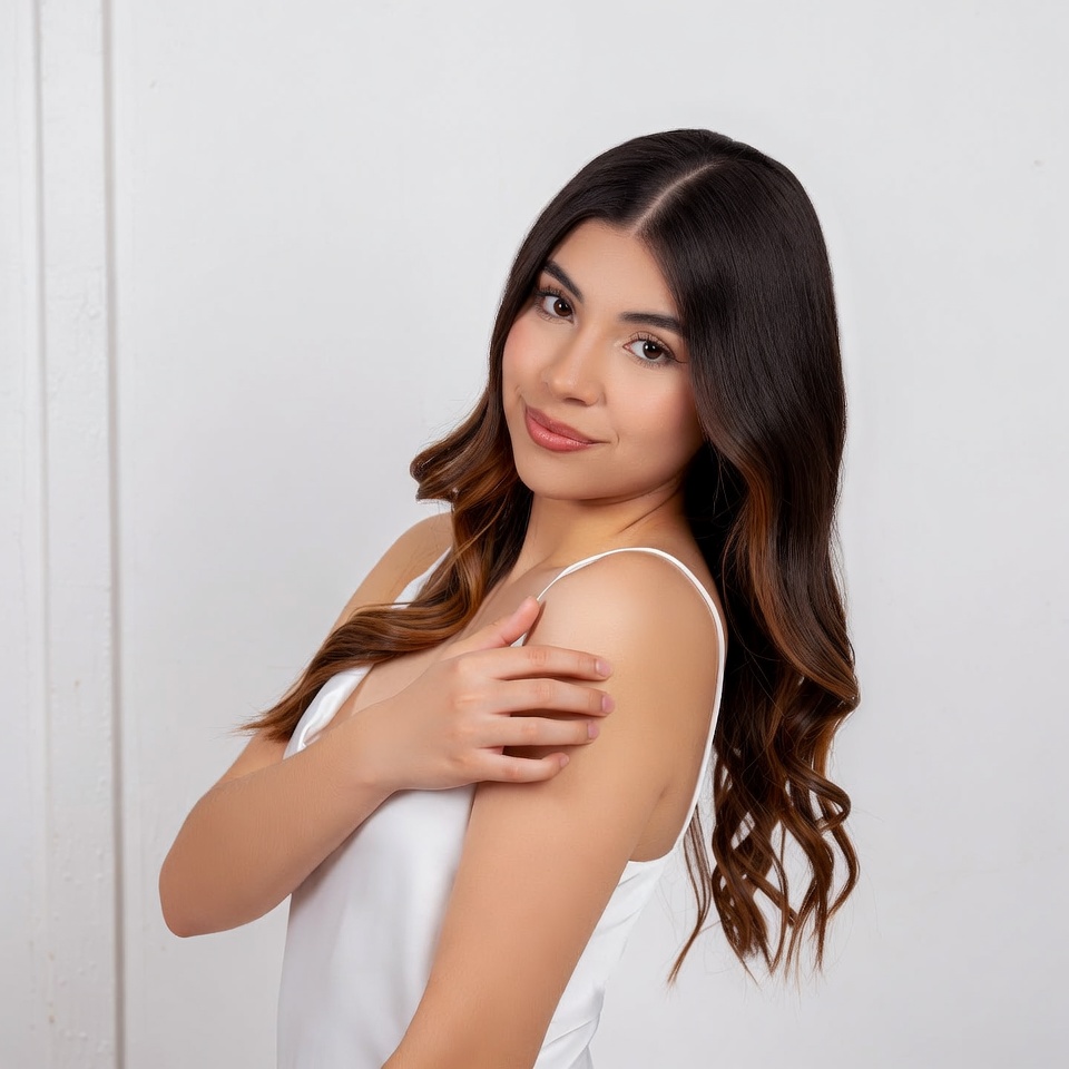 A young Latino woman with long wavy dark brown hair stands sideways against a plain white background. She wears a thin-strapped white tank top and smiles softly while touching her shoulder with her hand. Her pose is relaxed and confident.