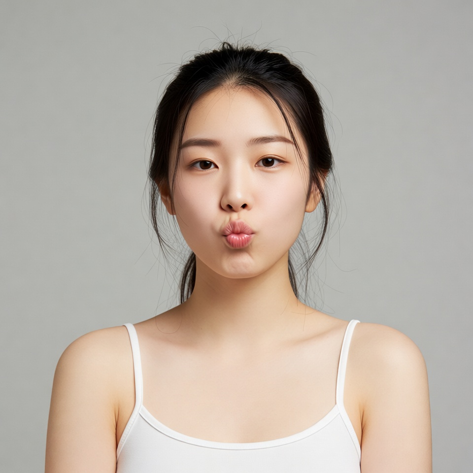 A young Asian woman with long dark hair tied in a ponytail puckers her lips into a kissy face. She wears a white spaghetti strap tank top and stands against a plain gray background. Her expression is playful with slightly squinted eyes.