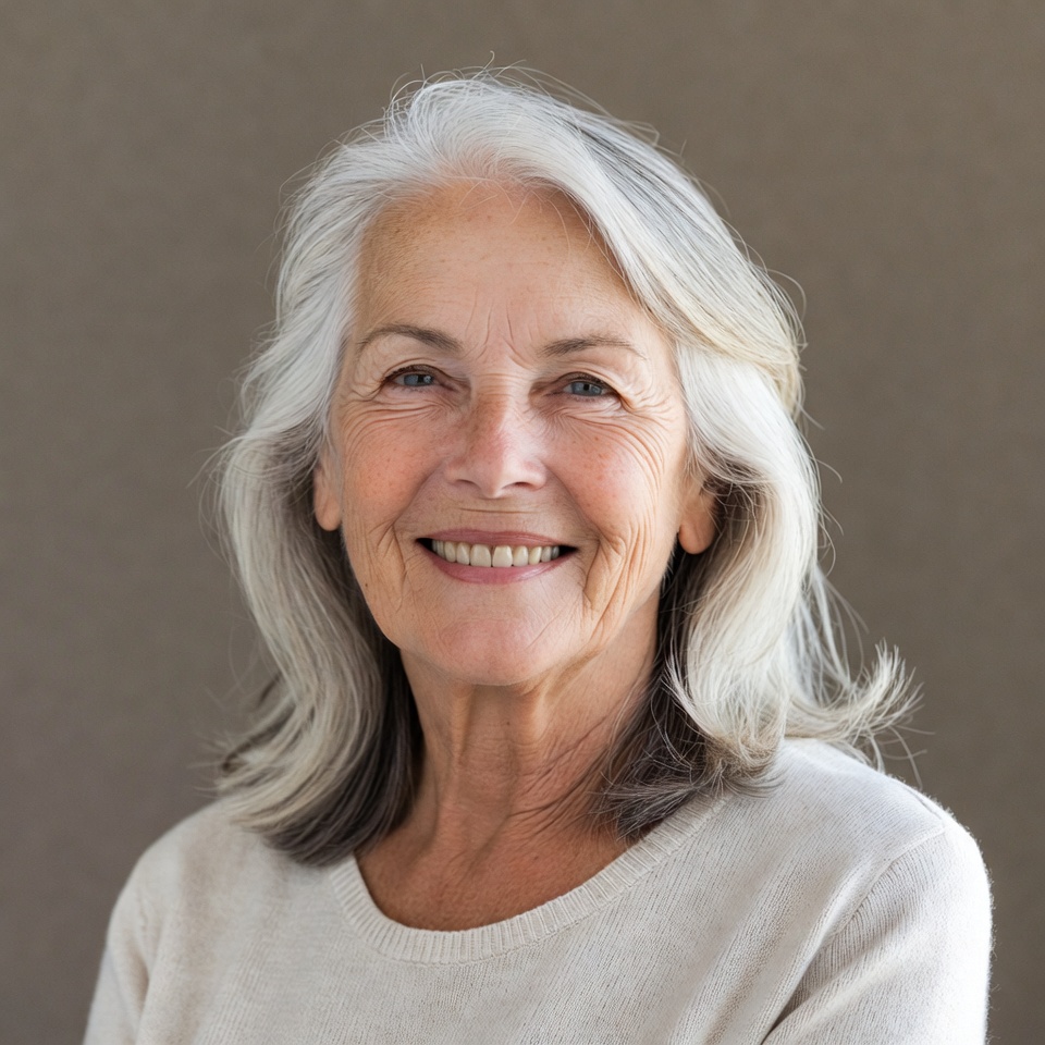 White, beige background, blue eyes, female, gray hair, happy face, headshot, light top, long hair, mature woman, older woman, portrait, senior woman, silver hair, smiling woman, woman smiling, wrinkles, elderly woman