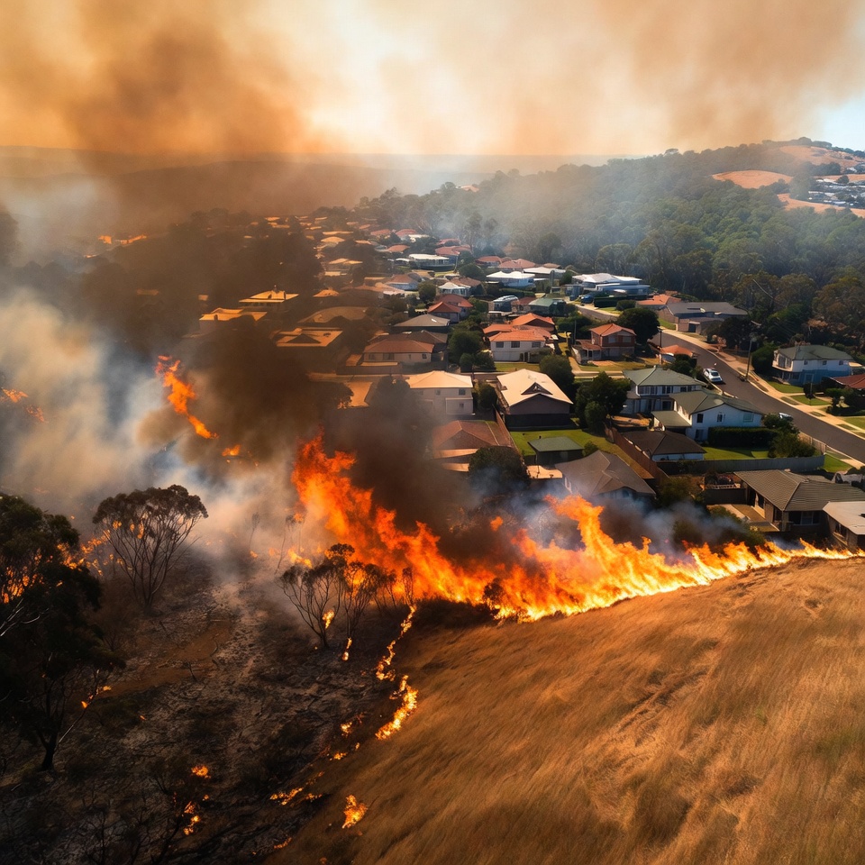 Aerial view shows intense bushfire flames and thick smoke advancing toward rows of residential houses in a suburban area. Fiery front burns through dry grass and eucalyptus trees on a hillside, with orange flames contrasting against dark smoke clouds. Houses with red roofs line streets below the encroaching wildfire.