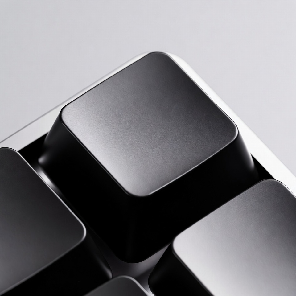 A close-up view of black square keyboard keys arranged in a grid. The keys have a glossy matte finish and are set against a light gray background. The image captures the edges and surfaces of multiple keys from an angled perspective.