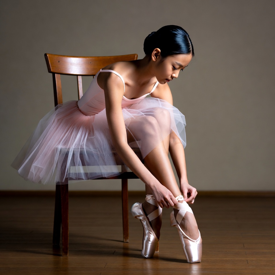 Asian, Asian dancer, ballet dancer, ballet slippers, bun hairstyle, child dancer, dancer, female, legs extended, leotard, pink balletwear, pink tutu, pointe shoes, sitting pose, studio background, tutu skirt, tying laces, wooden chair, young girl, ballet girl